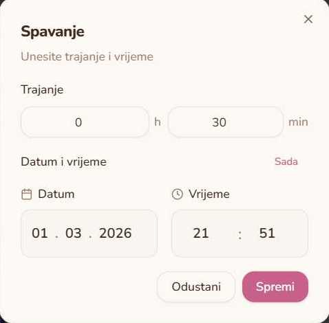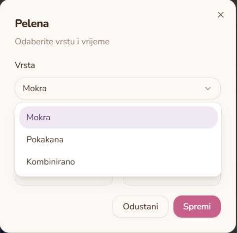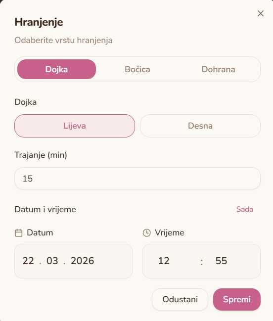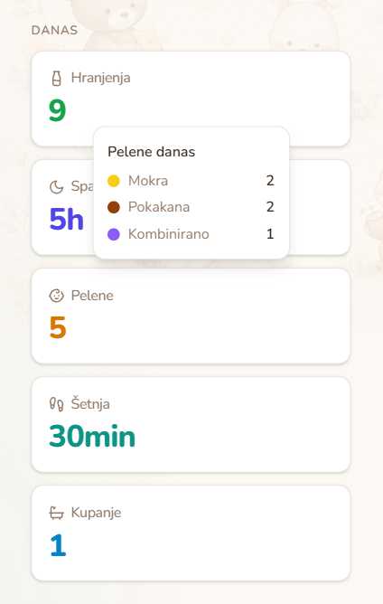 Brzi unos hranjenja, spavanja i pelena direktno s početnog ekrana. Bez obrazaca, bez kompliciranja — za nekoliko sekundi.